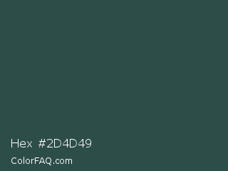 Hex #2d4d49 Color is a dark cyan color and the nearest color is Dark Slate Gray #2f4f4f. Hex code #2d4d49 and RGB value is rgb(45,77,73). In RGB color space, this color is composed of 18% red, 30% green, 29% blue, In CMYK color space, this color is composed of 42% cyan, 0% magenta, 5% yellow , 70% black , In HSL color space, this color has a hue angle of 173° , 26% saturation and 24% lightness.