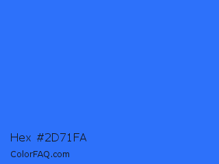 Hex #2d71fa Color is a normal blue color and the nearest color is Blue Crayola #1f75fe. Hex code #2d71fa and RGB value is rgb(45,113,250). In RGB color space, this color is composed of 18% red, 44% green, 98% blue, In CMYK color space, this color is composed of 82% cyan, 55% magenta, 0% yellow , 2% black , In HSL color space, this color has a hue angle of 220° , 95% saturation and 58% lightness.