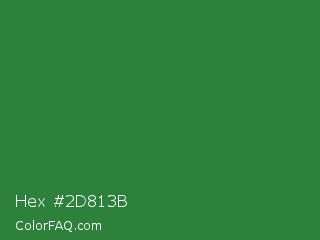 Hex #2d813b Color is a normal green color and the nearest color is Goblin #3d7d52. Hex code #2d813b and RGB value is rgb(45,129,59). In RGB color space, this color is composed of 18% red, 51% green, 23% blue, In CMYK color space, this color is composed of 65% cyan, 0% magenta, 54% yellow , 49% black , In HSL color space, this color has a hue angle of 130° , 48% saturation and 34% lightness.