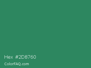 Hex #2d8760 Color is a normal green color and the nearest color is Eucalyptus #278a5b. Hex code #2d8760 and RGB value is rgb(45,135,96). In RGB color space, this color is composed of 18% red, 53% green, 38% blue, In CMYK color space, this color is composed of 67% cyan, 0% magenta, 29% yellow , 47% black , In HSL color space, this color has a hue angle of 154° , 50% saturation and 35% lightness.