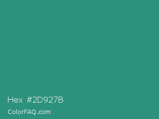 Hex #2d927b Color is a normal cyan color and the nearest color is Illuminating Emerald #319177. Hex code #2d927b and RGB value is rgb(45,146,123). In RGB color space, this color is composed of 18% red, 57% green, 48% blue, In CMYK color space, this color is composed of 69% cyan, 0% magenta, 16% yellow , 43% black , In HSL color space, this color has a hue angle of 166° , 53% saturation and 37% lightness.
