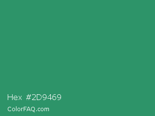 Hex #2d9469 Color is a normal green color and the nearest color is Illuminating Emerald #319177. Hex code #2d9469 and RGB value is rgb(45,148,105). In RGB color space, this color is composed of 18% red, 58% green, 41% blue, In CMYK color space, this color is composed of 70% cyan, 0% magenta, 29% yellow , 42% black , In HSL color space, this color has a hue angle of 155° , 53% saturation and 38% lightness.
