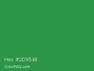 Hex #2d9548 Color is a normal green color and the nearest color is Sea Green #2e8b57. Hex code #2d9548 and RGB value is rgb(45,149,72). In RGB color space, this color is composed of 18% red, 58% green, 28% blue, In CMYK color space, this color is composed of 70% cyan, 0% magenta, 52% yellow , 42% black , In HSL color space, this color has a hue angle of 136° , 54% saturation and 38% lightness.