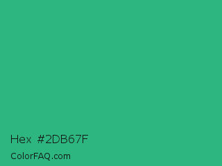 Hex #2db67f Color is a normal green color and the nearest color is Jungle Green #29ab87. Hex code #2db67f and RGB value is rgb(45,182,127). In RGB color space, this color is composed of 18% red, 71% green, 50% blue, In CMYK color space, this color is composed of 75% cyan, 0% magenta, 30% yellow , 29% black , In HSL color space, this color has a hue angle of 156° , 60% saturation and 45% lightness.