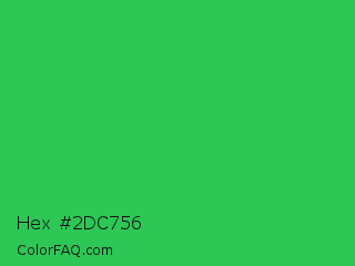 Hex #2dc756 Color is a normal green color and the nearest color is UFO Green #3cd070. Hex code #2dc756 and RGB value is rgb(45,199,86). In RGB color space, this color is composed of 18% red, 78% green, 34% blue, In CMYK color space, this color is composed of 77% cyan, 0% magenta, 57% yellow , 22% black , In HSL color space, this color has a hue angle of 136° , 63% saturation and 48% lightness.
