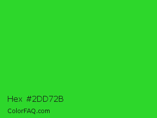 Hex #2dd72b Color is a normal green color and the nearest color is Lime Green #32cd32. Hex code #2dd72b and RGB value is rgb(45,215,43). In RGB color space, this color is composed of 18% red, 84% green, 17% blue, In CMYK color space, this color is composed of 79% cyan, 0% magenta, 80% yellow , 16% black , In HSL color space, this color has a hue angle of 119° , 68% saturation and 51% lightness.