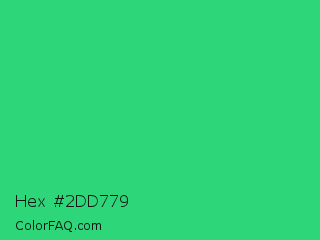 Hex #2dd779 Color is a normal green color and the nearest color is UFO Green #3cd070. Hex code #2dd779 and RGB value is rgb(45,215,121). In RGB color space, this color is composed of 18% red, 84% green, 47% blue, In CMYK color space, this color is composed of 79% cyan, 0% magenta, 44% yellow , 16% black , In HSL color space, this color has a hue angle of 147° , 68% saturation and 51% lightness.