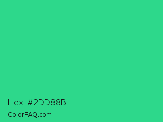 Hex #2dd88b Color is a normal green color and the nearest color is Shamrock #33cc99. Hex code #2dd88b and RGB value is rgb(45,216,139). In RGB color space, this color is composed of 18% red, 85% green, 55% blue, In CMYK color space, this color is composed of 79% cyan, 0% magenta, 36% yellow , 15% black , In HSL color space, this color has a hue angle of 153° , 69% saturation and 51% lightness.