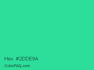 Hex #2dde9a Color is a normal green color and the nearest color is Shamrock #33cc99. Hex code #2dde9a and RGB value is rgb(45,222,154). In RGB color space, this color is composed of 18% red, 87% green, 60% blue, In CMYK color space, this color is composed of 80% cyan, 0% magenta, 31% yellow , 13% black , In HSL color space, this color has a hue angle of 157° , 73% saturation and 52% lightness.