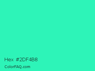 Hex #2df4b8 Color is a normal green color and the nearest color is Turquoise PWG #30d5c8. Hex code #2df4b8 and RGB value is rgb(45,244,184). In RGB color space, this color is composed of 18% red, 96% green, 72% blue, In CMYK color space, this color is composed of 82% cyan, 0% magenta, 25% yellow , 4% black , In HSL color space, this color has a hue angle of 162° , 90% saturation and 57% lightness.