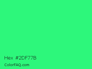 Hex #2df77b Color is a normal green color and the nearest color is UFO Green #3cd070. Hex code #2df77b and RGB value is rgb(45,247,123). In RGB color space, this color is composed of 18% red, 97% green, 48% blue, In CMYK color space, this color is composed of 82% cyan, 0% magenta, 50% yellow , 3% black , In HSL color space, this color has a hue angle of 143° , 93% saturation and 57% lightness.