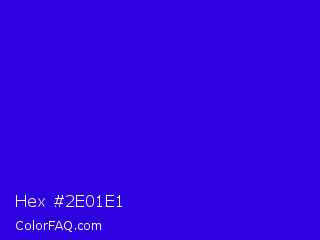 Hex #2e01e1 Color is a normal indigo color and the nearest color is Interdimensional Blue #360ccc. Hex code #2e01e1 and RGB value is rgb(46,1,225). In RGB color space, this color is composed of 18% red, 0% green, 88% blue, In CMYK color space, this color is composed of 80% cyan, 100% magenta, 0% yellow , 12% black , In HSL color space, this color has a hue angle of 252° , 99% saturation and 44% lightness.