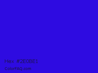 Hex #2e0be1 Color is a normal indigo color and the nearest color is Interdimensional Blue #360ccc. Hex code #2e0be1 and RGB value is rgb(46,11,225). In RGB color space, this color is composed of 18% red, 4% green, 88% blue, In CMYK color space, this color is composed of 80% cyan, 95% magenta, 0% yellow , 12% black , In HSL color space, this color has a hue angle of 250° , 91% saturation and 46% lightness.