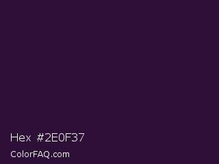 Hex #2e0f37 Color is a very dark purple color and the nearest color is Revolver #2c1632. Hex code #2e0f37 and RGB value is rgb(46,15,55). In RGB color space, this color is composed of 18% red, 6% green, 22% blue, In CMYK color space, this color is composed of 16% cyan, 73% magenta, 0% yellow , 78% black , In HSL color space, this color has a hue angle of 287° , 57% saturation and 14% lightness.