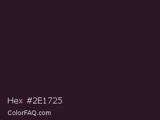 Hex #2e1725 Color is a very dark magenta color and the nearest color is Cocoa Brown #301f1e. Hex code #2e1725 and RGB value is rgb(46,23,37). In RGB color space, this color is composed of 18% red, 9% green, 15% blue, In CMYK color space, this color is composed of 0% cyan, 50% magenta, 20% yellow , 82% black , In HSL color space, this color has a hue angle of 323° , 33% saturation and 14% lightness.