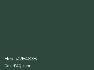 Hex #2e483b Color is a dark green color and the nearest color is Lunar Green #3c493a. Hex code #2e483b and RGB value is rgb(46,72,59). In RGB color space, this color is composed of 18% red, 28% green, 23% blue, In CMYK color space, this color is composed of 36% cyan, 0% magenta, 18% yellow , 72% black , In HSL color space, this color has a hue angle of 150° , 22% saturation and 23% lightness.