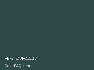 Hex #2e4a47 Color is a dark cyan color and the nearest color is Dark Slate Gray #2f4f4f. Hex code #2e4a47 and RGB value is rgb(46,74,71). In RGB color space, this color is composed of 18% red, 29% green, 28% blue, In CMYK color space, this color is composed of 38% cyan, 0% magenta, 4% yellow , 71% black , In HSL color space, this color has a hue angle of 174° , 23% saturation and 24% lightness.