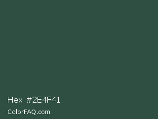Hex #2e4f41 Color is a dark green color and the nearest color is Plantation #27504b. Hex code #2e4f41 and RGB value is rgb(46,79,65). In RGB color space, this color is composed of 18% red, 31% green, 25% blue, In CMYK color space, this color is composed of 42% cyan, 0% magenta, 18% yellow , 69% black , In HSL color space, this color has a hue angle of 155° , 26% saturation and 25% lightness.
