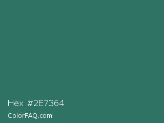 Hex #2e7364 Color is a normal cyan color and the nearest color is Myrtle Green #317873. Hex code #2e7364 and RGB value is rgb(46,115,100). In RGB color space, this color is composed of 18% red, 45% green, 39% blue, In CMYK color space, this color is composed of 60% cyan, 0% magenta, 13% yellow , 55% black , In HSL color space, this color has a hue angle of 167° , 43% saturation and 32% lightness.