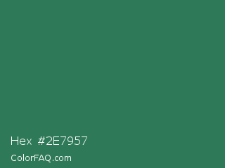Hex #2e7957 Color is a normal green color and the nearest color is Amazon #3b7a57. Hex code #2e7957 and RGB value is rgb(46,121,87). In RGB color space, this color is composed of 18% red, 47% green, 34% blue, In CMYK color space, this color is composed of 62% cyan, 0% magenta, 28% yellow , 53% black , In HSL color space, this color has a hue angle of 153° , 45% saturation and 33% lightness.