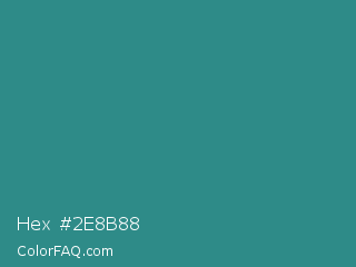 Hex #2e8b88 Color is a normal cyan color and the nearest color is Lochinvar #2c8c84. Hex code #2e8b88 and RGB value is rgb(46,139,136). In RGB color space, this color is composed of 18% red, 55% green, 53% blue, In CMYK color space, this color is composed of 67% cyan, 0% magenta, 2% yellow , 45% black , In HSL color space, this color has a hue angle of 178° , 50% saturation and 36% lightness.