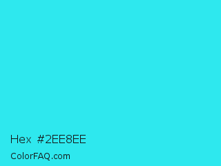 Hex #2ee8ee Color is a normal cyan color and the nearest color is Loeen #15f2fd. Hex code #2ee8ee and RGB value is rgb(46,232,238). In RGB color space, this color is composed of 18% red, 91% green, 93% blue, In CMYK color space, this color is composed of 81% cyan, 3% magenta, 0% yellow , 7% black , In HSL color space, this color has a hue angle of 182° , 85% saturation and 56% lightness.