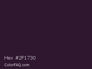 Hex #2f1730 Color is a very dark magenta color and the nearest color is Revolver #2c1632. Hex code #2f1730 and RGB value is rgb(47,23,48). In RGB color space, this color is composed of 18% red, 9% green, 19% blue, In CMYK color space, this color is composed of 2% cyan, 52% magenta, 0% yellow , 81% black , In HSL color space, this color has a hue angle of 298° , 35% saturation and 14% lightness.
