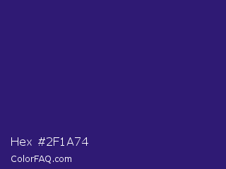 Hex #2f1a74 Color is a dark indigo color and the nearest color is Persian Indigo #32127a. Hex code #2f1a74 and RGB value is rgb(47,26,116). In RGB color space, this color is composed of 18% red, 10% green, 45% blue, In CMYK color space, this color is composed of 59% cyan, 78% magenta, 0% yellow , 55% black , In HSL color space, this color has a hue angle of 254° , 63% saturation and 28% lightness.