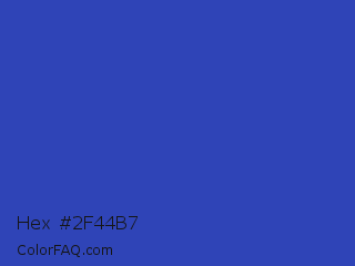 Hex #2f44b7 Color is a normal blue color and the nearest color is Violet Blue #324ab2. Hex code #2f44b7 and RGB value is rgb(47,68,183). In RGB color space, this color is composed of 18% red, 27% green, 72% blue, In CMYK color space, this color is composed of 74% cyan, 63% magenta, 0% yellow , 28% black , In HSL color space, this color has a hue angle of 231° , 59% saturation and 45% lightness.