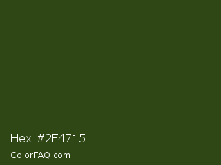 Hex #2f4715 Color is a very dark green color and the nearest color is Clover #384910. Hex code #2f4715 and RGB value is rgb(47,71,21). In RGB color space, this color is composed of 18% red, 28% green, 8% blue, In CMYK color space, this color is composed of 34% cyan, 0% magenta, 70% yellow , 72% black , In HSL color space, this color has a hue angle of 89° , 54% saturation and 18% lightness.
