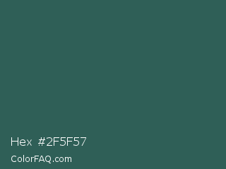 Hex #2f5f57 Color is a dark cyan color and the nearest color is Spectra #2f5a57. Hex code #2f5f57 and RGB value is rgb(47,95,87). In RGB color space, this color is composed of 18% red, 37% green, 34% blue, In CMYK color space, this color is composed of 51% cyan, 0% magenta, 8% yellow , 63% black , In HSL color space, this color has a hue angle of 170° , 34% saturation and 28% lightness.