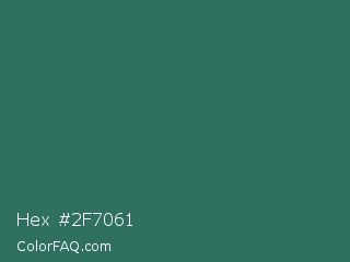 Hex #2f7061 Color is a normal cyan color and the nearest color is Casal #2f6168. Hex code #2f7061 and RGB value is rgb(47,112,97). In RGB color space, this color is composed of 18% red, 44% green, 38% blue, In CMYK color space, this color is composed of 58% cyan, 0% magenta, 13% yellow , 56% black , In HSL color space, this color has a hue angle of 166° , 41% saturation and 31% lightness.