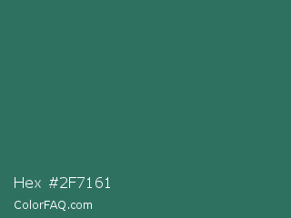 Hex #2f7161 Color is a normal cyan color and the nearest color is Casal #2f6168. Hex code #2f7161 and RGB value is rgb(47,113,97). In RGB color space, this color is composed of 18% red, 44% green, 38% blue, In CMYK color space, this color is composed of 58% cyan, 0% magenta, 14% yellow , 56% black , In HSL color space, this color has a hue angle of 165° , 41% saturation and 31% lightness.