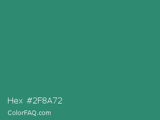 Hex #2f8a72 Color is a normal cyan color and the nearest color is Illuminating Emerald #319177. Hex code #2f8a72 and RGB value is rgb(47,138,114). In RGB color space, this color is composed of 18% red, 54% green, 45% blue, In CMYK color space, this color is composed of 66% cyan, 0% magenta, 17% yellow , 46% black , In HSL color space, this color has a hue angle of 164° , 49% saturation and 36% lightness.