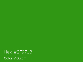 Hex #2f9713 Color is a normal green color and the nearest color is Slimy Green #299617. Hex code #2f9713 and RGB value is rgb(47,151,19). In RGB color space, this color is composed of 18% red, 59% green, 7% blue, In CMYK color space, this color is composed of 69% cyan, 0% magenta, 87% yellow , 41% black , In HSL color space, this color has a hue angle of 107° , 78% saturation and 33% lightness.