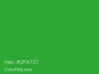 Hex #2fa737 Color is a normal green color and the nearest color is Wageningen Green #34b233. Hex code #2fa737 and RGB value is rgb(47,167,55). In RGB color space, this color is composed of 18% red, 65% green, 22% blue, In CMYK color space, this color is composed of 72% cyan, 0% magenta, 67% yellow , 35% black , In HSL color space, this color has a hue angle of 124° , 56% saturation and 42% lightness.