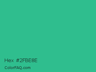 Hex #2fbe8e Color is a normal green color and the nearest color is Mountain Meadow #30ba8f. Hex code #2fbe8e and RGB value is rgb(47,190,142). In RGB color space, this color is composed of 18% red, 75% green, 56% blue, In CMYK color space, this color is composed of 75% cyan, 0% magenta, 25% yellow , 25% black , In HSL color space, this color has a hue angle of 160° , 60% saturation and 46% lightness.