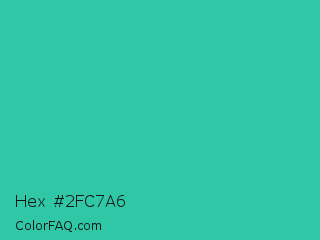 Hex #2fc7a6 Color is a normal cyan color and the nearest color is Shamrock #33cc99. Hex code #2fc7a6 and RGB value is rgb(47,199,166). In RGB color space, this color is composed of 18% red, 78% green, 65% blue, In CMYK color space, this color is composed of 76% cyan, 0% magenta, 17% yellow , 22% black , In HSL color space, this color has a hue angle of 167° , 62% saturation and 48% lightness.