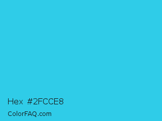Hex #2fcce8 Color is a normal cyan color and the nearest color is Scooter #2ebfd4. Hex code #2fcce8 and RGB value is rgb(47,204,232). In RGB color space, this color is composed of 18% red, 80% green, 91% blue, In CMYK color space, this color is composed of 80% cyan, 12% magenta, 0% yellow , 9% black , In HSL color space, this color has a hue angle of 189° , 80% saturation and 55% lightness.
