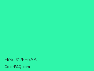 Hex #2ff6aa Color is a normal green color and the nearest color is Eucalyptus #44d7a8. Hex code #2ff6aa and RGB value is rgb(47,246,170). In RGB color space, this color is composed of 18% red, 96% green, 67% blue, In CMYK color space, this color is composed of 81% cyan, 0% magenta, 31% yellow , 4% black , In HSL color space, this color has a hue angle of 157° , 92% saturation and 57% lightness.
