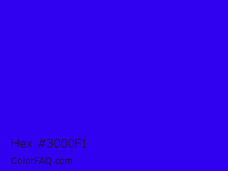 Hex #3000f1 Color is a normal indigo color and the nearest color is Electric Ultramarine #3f00ff. Hex code #3000f1 and RGB value is rgb(48,0,241). In RGB color space, this color is composed of 19% red, 0% green, 95% blue, In CMYK color space, this color is composed of 80% cyan, 100% magenta, 0% yellow , 5% black , In HSL color space, this color has a hue angle of 252° , 100% saturation and 47% lightness.