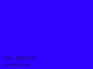 Hex #3001ff Color is a normal indigo color and the nearest color is Electric Ultramarine #3f00ff. Hex code #3001ff and RGB value is rgb(48,1,255). In RGB color space, this color is composed of 19% red, 0% green, 100% blue, In CMYK color space, this color is composed of 81% cyan, 100% magenta, 0% yellow , 0% black , In HSL color space, this color has a hue angle of 251° , 100% saturation and 50% lightness.