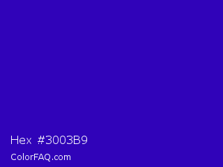 Hex #3003b9 Color is a normal indigo color and the nearest color is Interdimensional Blue #360ccc. Hex code #3003b9 and RGB value is rgb(48,3,185). In RGB color space, this color is composed of 19% red, 1% green, 73% blue, In CMYK color space, this color is composed of 74% cyan, 98% magenta, 0% yellow , 27% black , In HSL color space, this color has a hue angle of 255° , 97% saturation and 37% lightness.