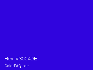 Hex #3004de Color is a normal indigo color and the nearest color is Interdimensional Blue #360ccc. Hex code #3004de and RGB value is rgb(48,4,222). In RGB color space, this color is composed of 19% red, 2% green, 87% blue, In CMYK color space, this color is composed of 78% cyan, 98% magenta, 0% yellow , 13% black , In HSL color space, this color has a hue angle of 252° , 96% saturation and 44% lightness.