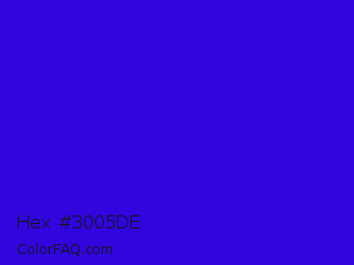 Hex #3005de Color is a normal indigo color and the nearest color is Interdimensional Blue #360ccc. Hex code #3005de and RGB value is rgb(48,5,222). In RGB color space, this color is composed of 19% red, 2% green, 87% blue, In CMYK color space, this color is composed of 78% cyan, 98% magenta, 0% yellow , 13% black , In HSL color space, this color has a hue angle of 252° , 96% saturation and 45% lightness.