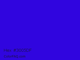 Hex #3005df Color is a normal indigo color and the nearest color is Interdimensional Blue #360ccc. Hex code #3005df and RGB value is rgb(48,5,223). In RGB color space, this color is composed of 19% red, 2% green, 87% blue, In CMYK color space, this color is composed of 78% cyan, 98% magenta, 0% yellow , 13% black , In HSL color space, this color has a hue angle of 252° , 96% saturation and 45% lightness.