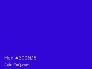 Hex #3006d8 Color is a normal indigo color and the nearest color is Interdimensional Blue #360ccc. Hex code #3006d8 and RGB value is rgb(48,6,216). In RGB color space, this color is composed of 19% red, 2% green, 85% blue, In CMYK color space, this color is composed of 78% cyan, 97% magenta, 0% yellow , 15% black , In HSL color space, this color has a hue angle of 252° , 95% saturation and 44% lightness.
