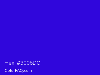Hex #3006dc Color is a normal indigo color and the nearest color is Interdimensional Blue #360ccc. Hex code #3006dc and RGB value is rgb(48,6,220). In RGB color space, this color is composed of 19% red, 2% green, 86% blue, In CMYK color space, this color is composed of 78% cyan, 97% magenta, 0% yellow , 14% black , In HSL color space, this color has a hue angle of 252° , 95% saturation and 44% lightness.