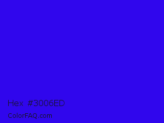Hex #3006ed Color is a normal indigo color and the nearest color is Electric Ultramarine #3f00ff. Hex code #3006ed and RGB value is rgb(48,6,237). In RGB color space, this color is composed of 19% red, 2% green, 93% blue, In CMYK color space, this color is composed of 80% cyan, 97% magenta, 0% yellow , 7% black , In HSL color space, this color has a hue angle of 251° , 95% saturation and 48% lightness.