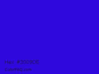 Hex #3009de Color is a normal indigo color and the nearest color is Interdimensional Blue #360ccc. Hex code #3009de and RGB value is rgb(48,9,222). In RGB color space, this color is composed of 19% red, 4% green, 87% blue, In CMYK color space, this color is composed of 78% cyan, 96% magenta, 0% yellow , 13% black , In HSL color space, this color has a hue angle of 251° , 92% saturation and 45% lightness.